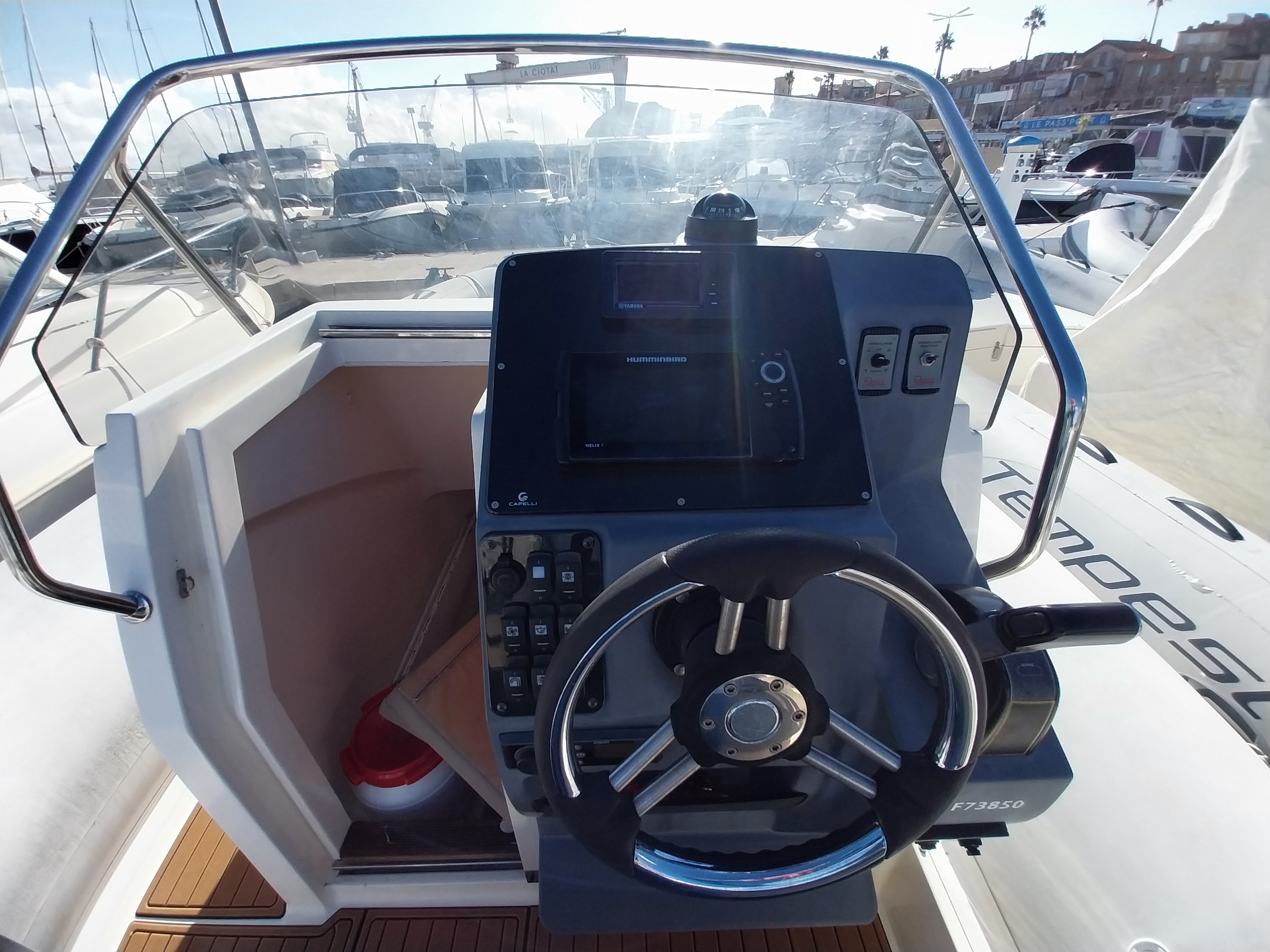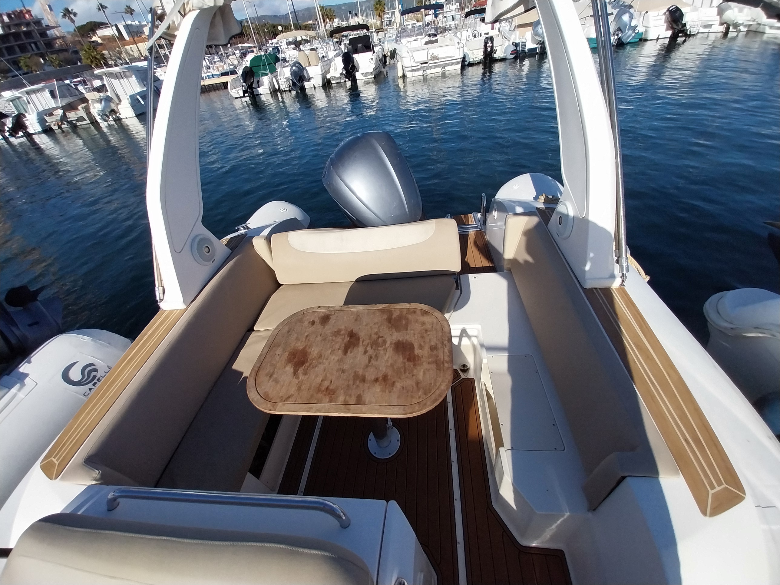 Bain de soleil avant et arrière - Guindeau électrique - Bimini - Douchette - Stéréo Bluetooth - Prise 12V - Prise USB - Table amovible - Bain de soleil avant et arrière - Sondeur/GPS